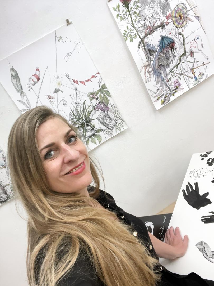 Her works are narrative and characterized by magical realism. They revolve around the big questions of life in the search for our essence, our origins, and our future, and are an attempt to convey an idea of ourselves. Larissa Leverenz works across media, focusing on screen printing, drawing, and painting. Analog drawings and objects are digitized and manipulated before being reprinted analogously. This transformation process plays with the characteristics of recognition and alienation, microcosm and macrocosm.