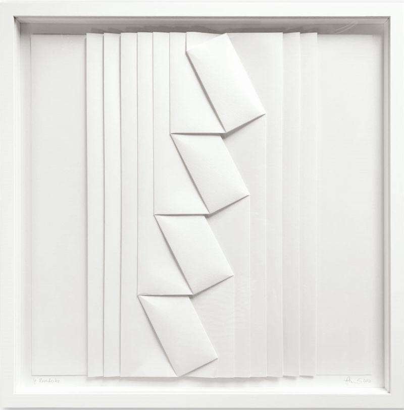 In his series made of pure white Canson watercolor paper or the 640g heavy handmade paper, the mathematical possibilities of this technique are revealed in all their variations. His folded works of undyed or dyed felt, which has been Weber’s dominant material since 2001, exhibit a stark materiality. In addition to felt and paper, Weber also uses materials such as canvas, cotton, synthetic materials and even steel. In late 2017, he created his first folded steel reliefs.